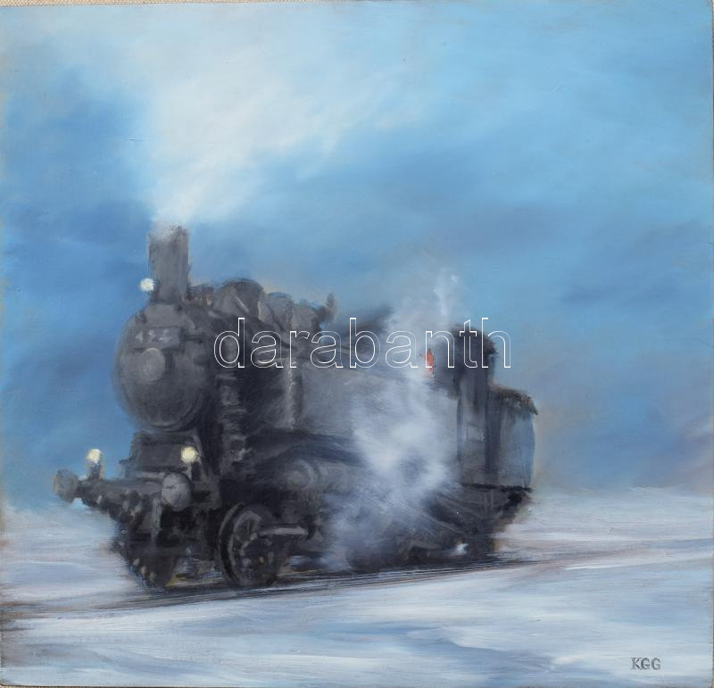 Kovács-Gombos Gábor (1955-): 124 (Mozdony), Olaj, farost, jelzett, hátoldalán autográf felirattal. 25x24 cm Sérüléssel a képen. Keretben. Külső méret 42x42 cm