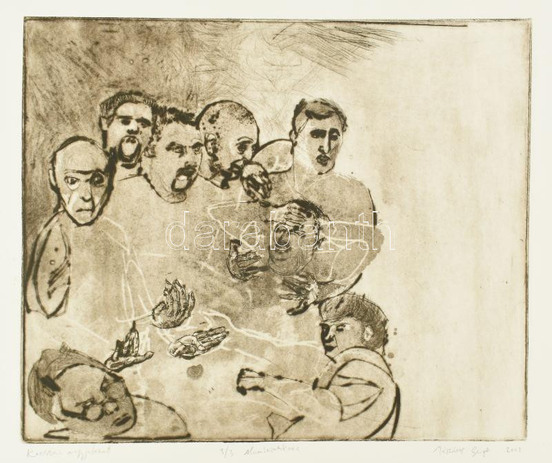 Leírás: Mészáros Gergő (-): Kocsmai nagyjelenet. Alukarc, papír. Jelzett. Számozott (3/3). 25x30 cm