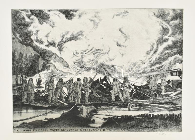 Leírás: Novák Lajos (1927-1989): A zsánai földgázkitörés elfojtása 1979. február 15.. Rézkarc, papír, jelzett, 29x39,5 cm