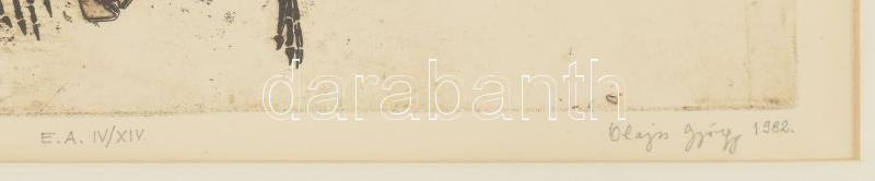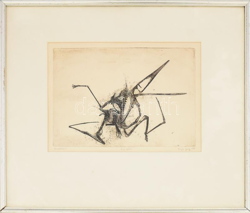 Leírás: Olajos György (1953-): Fosszília. Rézkarc, papír. jelzett, sorszámozott művészpéldány EA IV/ XV.. Üvegezett keretben 19x27 cm