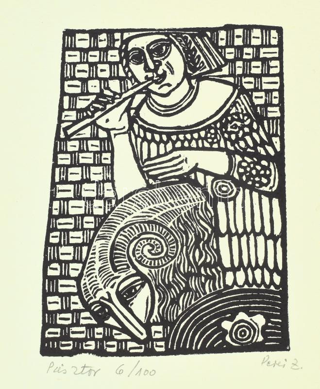 Leírás: Perei Zoltán (1913-1992): Pásztor. Linómetszet, merített papír, jelzett, 6/100 számozással. 15x11,5 cm