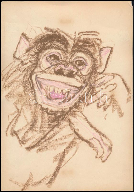 Leírás: Róna Emy (1904-1988): Nevető majom. Kréta, papír, hátoldalán hagyatéki pecséttel jelzett, 30x21 cm