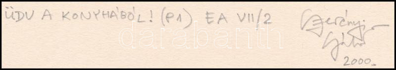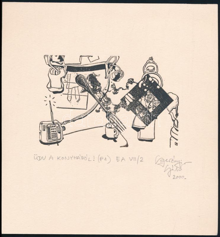 Leírás: Szerényi Gábor (1953-): Üdv a konyhából, 2000. Vonalas klisé, papír, jelzett, művészpéldány EA VII/2 számozással. 9x13,5 cm