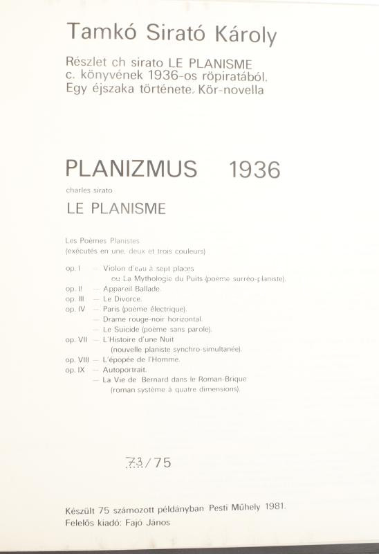 Tamkó Sirató Károly (1905-1980): Planizmus/ Le Planisme, 1936-1981. 9 db szitanyomat, papír. Részben jelzett a nyomaton. Számozott az előlapon (73/75). Készült 75 számozott példányban. Pesti Műhely, 1981. Felelős kiadó: Fajó János. Lapméret: 49x41,5 cm. Kiadói karton mappában. Előlap szélein kisebb elszíneződésekkel, máskülönben jó állapotban.