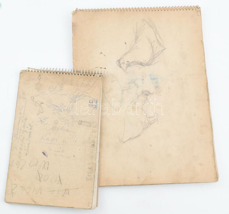 Leírás: Udvardi Gyula (1925-2016): 2 db vázlatfüzet kb. 42 db rajzzal. Klf. technikák, papír, jelzett a vázlatfüzetek borítóján, 15x24 és 25x32 cm méretekben