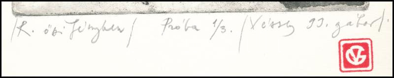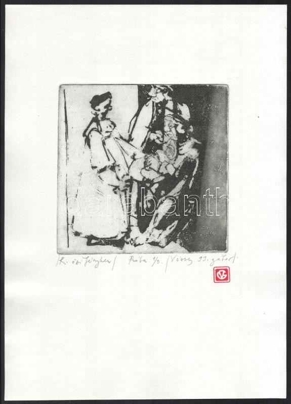 Leírás: Véssey Gábor (1948-): R. őszi fényben, 1999. Rézkarc, papír, jelzett, próbanyomat 1/3 számozással, 15×15 cm