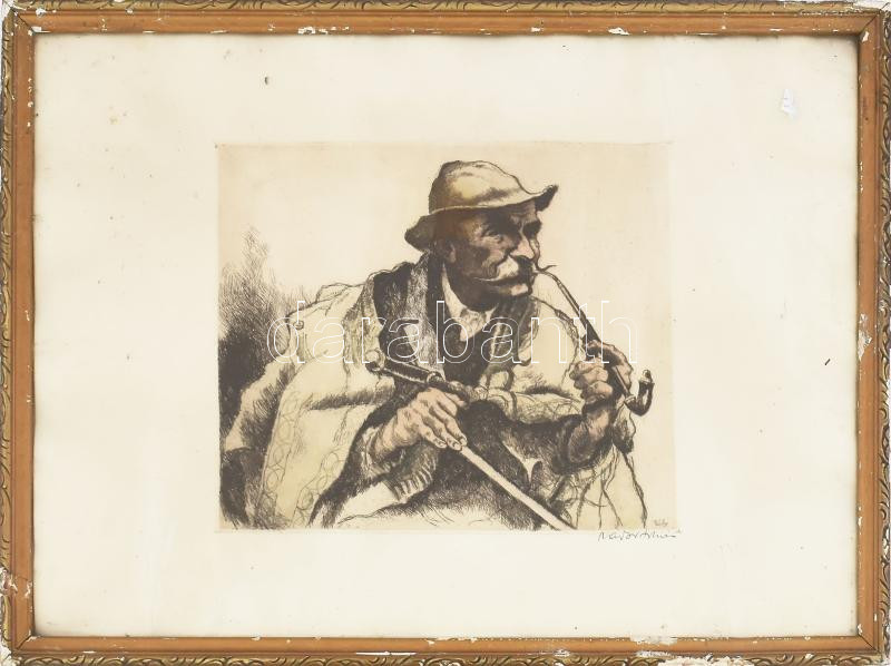 Zádor István (1882-1963): Pipázó férfi portréja, színezett rézkarc, pa...