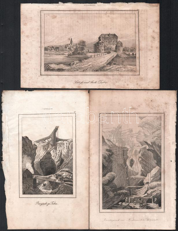 3 db régi svéd bányákat és várost (Örebro) ábrázoló metszet. Acélmetszet, papír, jelzés nélkül. XIX. sz. közepe. Mind foltos. Lap széle kissé sérült. 13x9 cm körüli méretben.