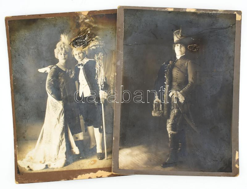 cca 1905 Fedák Sári színésznő portréja, János Vitéz jelmezben, keményhátú fotó, jelzés nélkül, felületi sérülésekkel, kissé vetemedett, 24x18 cm + egy további fotó beazonosítandó színészekkel, keményhátú fotó, jelzés nélkül, felületi sérülésekkel, kissé vetemedett, 24x18 cm