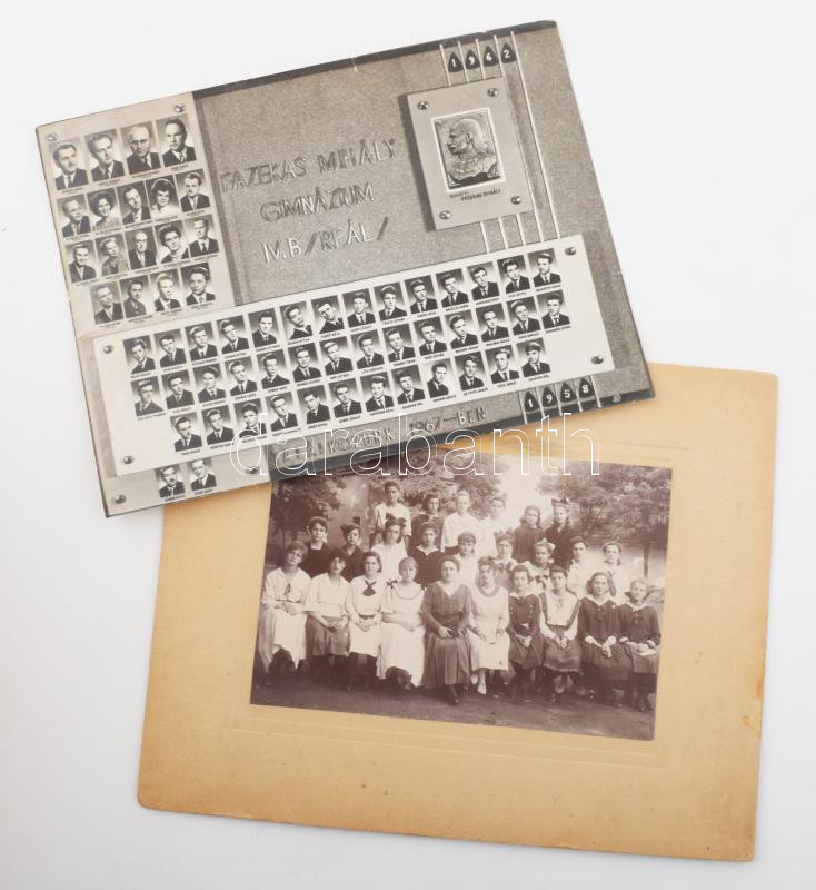 cca 1910-1962 2 db iskolai tablófotó, az egyik fotó kartonon, a másik fotó, a modern a Fazekas Mihály Gimnázium IV. B. (1958-1962) osztályának tablófotója, a hátoldalán a fotón szereplők aláírásaival.