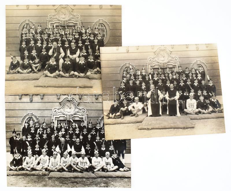 cca 1930-40 Budai Ciszterci Szent Imre Gimnázium udvara, 3 db csoportkép Levente fiúkkal egyenruhában, darutollas fejfedőkkel, néhányan kitüntetésekkel, szerzetes tanárokkal, jelzés nélküli fotók, 17x23 cm körüli méretekben
