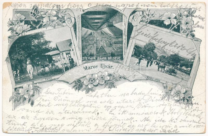 Leírás: 1904 Marosújvár, Uioara, Ocna Mures; fürdő, Stefánia bánya belseje, Király utca / spa, mine interior, street. Art Nouveau, floral (EB)