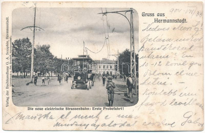 1904 Nagyszeben, Hermannstadt, Sibiu; Die neue elektrische Strassenbahn: Erste Probefahrt! Verlag G. A. Seraphin, Lichtdruck v. Jos. Drotleff / A villamos hálózat első elektromos kocsija Nagyszebenben, az első próbaút, tesztvezetés / the first electric omnibus (tram car) on its first test drive in Sibiu (fl)