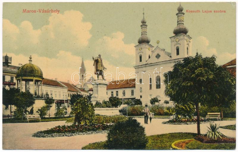1908 Marosvásárhely, Targu Mures; Kossuth Lajos szobor, takarékpénztár, biztosító intézet, Bodor kút. Révész Béla kiadása / monument, savings bank, insurance company, well