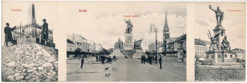 Leírás: 1909 Arad, Vesztőhely, Kossuth szobor és utca, Vértanú szobor. 2-részes kinyitható panorámalap / statues, square. 2-tiled folding panoramacard