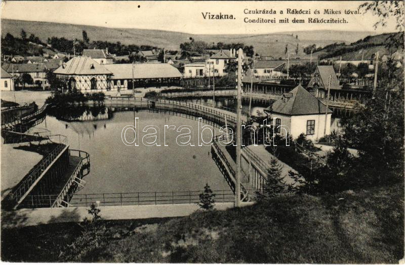 1913 Vízakna, Salzburg, Ocna Sibiului; Cukrászda, Rákóczi és Mikes tó. Hecht Otto kiadása / Conditorei mit dem Rákócziteich / confectionery, lakes, spa (EK)