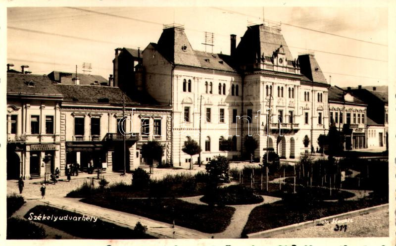 1940 Székelyudvarhely, Odorheiu Secuiesc; Vármegyeház, Illatszertár, Persian és Zimny üzlete. Kováts István fényképész / county hall, perfumery, shop. photo