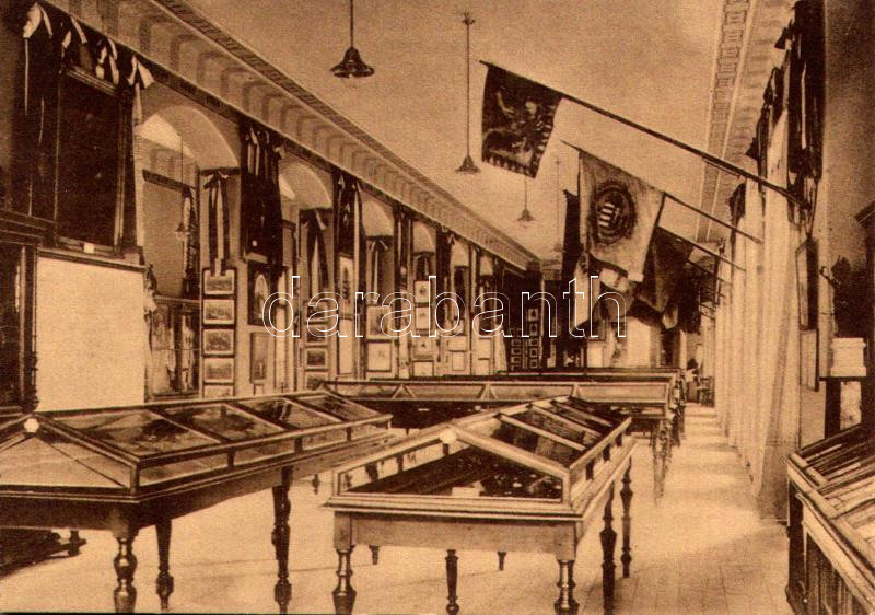 Arad, Ereklyemúzeum. A II. terem nyugati része, ellenségtől elvett fegyverek és osztrák gyalogsági lobogó. Kerpel Izsó kiadása / relic museum of the Hungarian Revolution of 1848 - képeslapfüzeből / from postcard booklet