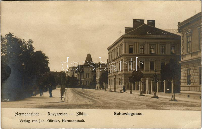 Nagyszeben, Hermannstadt, Sibiu; Schewisgasse. Verlag von Joh. Gürtler... https://www.darabanth.com/hu/471-Gyorsarveres/471.0/Kepeslapok/Erdely~2000006/Nagyszeben-Hermannstadt-Sibiu-Schewisgasse-Verlag-von-Joh-Gurtler-utca-street~II3102519