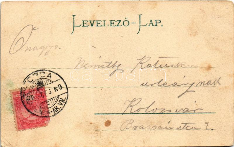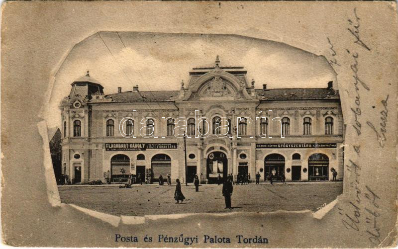 Torda, Turda; Posta és Pénzügyi palota, Flachbart Károly üzlete, Mike Márton gyógyszertára, Bethlemi műmalom lisztraktára / post office, financial palace, pharmacy, shops (kis szakadás / small tear)