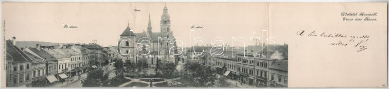 Leírás: 1901 Kassa, Kosice; Fő utca, dóm, üzletek. Eschwig Ede F. kiadása. Hajts Kornél felvétele. 3-részes kihajtható panorámalap / main street, cathedral, shops. 3-tiled folding panoramacard (r)