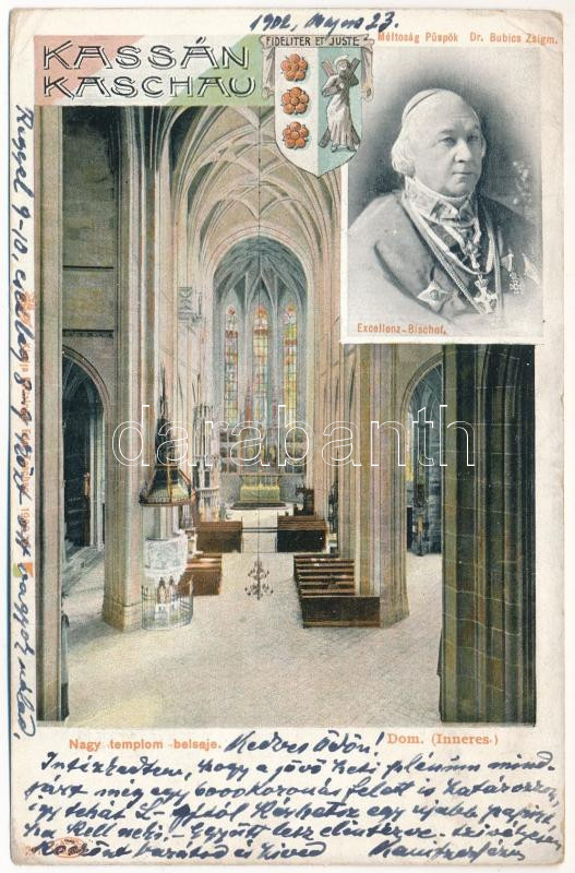 1902 Kassa, Kaschau, Kosice; Nagy templom belseje, Méltóság püspök Dr. Bubics Zsigmond, Fideliter et Juste címer. Feitzinger Ede 1902/12. 211. / cathedral interior, bishop, coat of arms. Art Nouveau (EK)