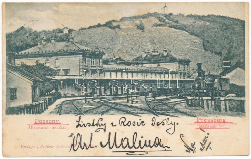 Leírás: 1902 Pozsony, Pressburg, Bratislava; Államvasúti indóház, vasútállomás, gőzmozdony, vonat. Bediene dich allein / Staatsbahnhof / railway station, locomotive, train (fl)
