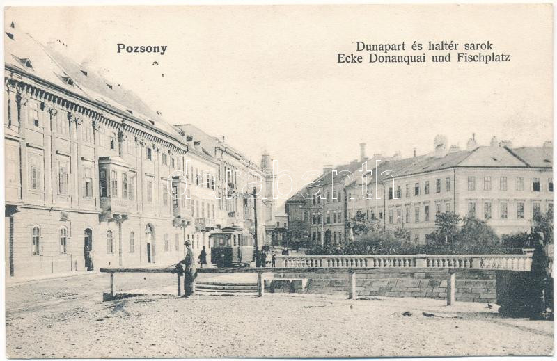 Leírás: 1907 Pozsony, Pressburg, Bratislava; Dunapart és Haltér sarok, villamos. Gelber kiadása / Ecke Donauquai und Fischplatz / street view, tram (EK)