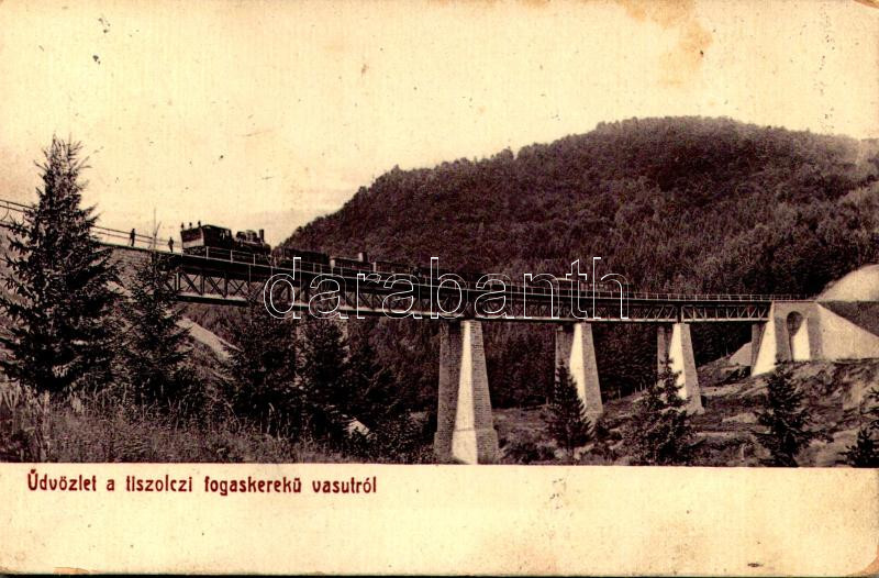 1910 Tiszolc, Tisovec; Tiszolc-völgyi fogaskerekű vasút Breznóbánya és Tiszolc között, iparvasút, gőzmozdony, híd, viadukt. W.L. Bp. Kiadja Kohn Albert / standard gauge cogwheel railway between Brezno nad Hronom and Tisovec, industrial railway viaduct, locomotive, bridge (kopott sarkak / worn corners)