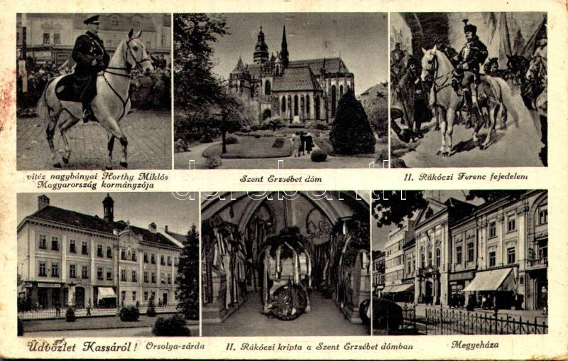 1942 Kassa, Kosice; Vitéz Nagybányai Horthy Miklós Magyarország kormányzója, bevonulás, Szent Erzsébet dóm, II. Rákóczi Ferenc fejedelem, Orsolya zárda, üzletek, II. Rákóczi kripta a dómban, Megyeháza / Regent Horthy (entry of the Hungarian troops), cathedral, Francis II Rákóczi, nunnery, shops, crypt, county hall (fl)