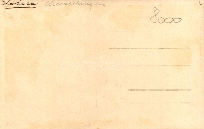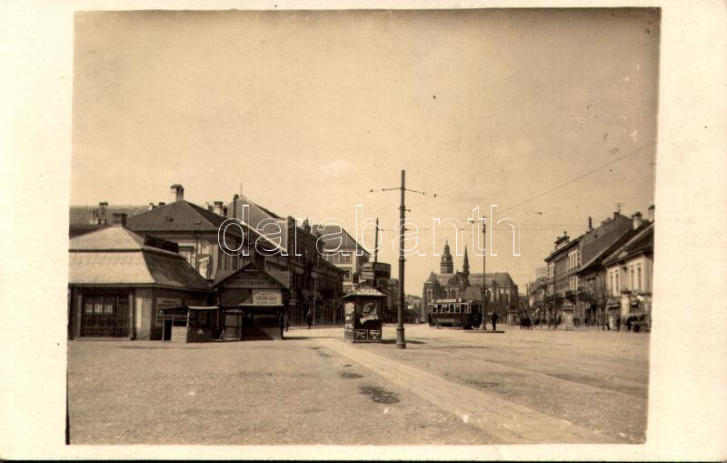 ~1930 Kassa, Kosice; utcakép, villamos Stollwerck és Armada krém reklámmal, bódék Auto Omnia reklámmal / street view with tram, shops and kiosks. photo (fl)
