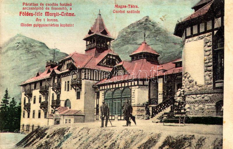 Leírás: Tátra, Magas Tátra, Vysoké Tatry; Csorbai szálloda. Földes-féle Margit-Créme reklám / hotel. Cosmetic cream advertisement (r)