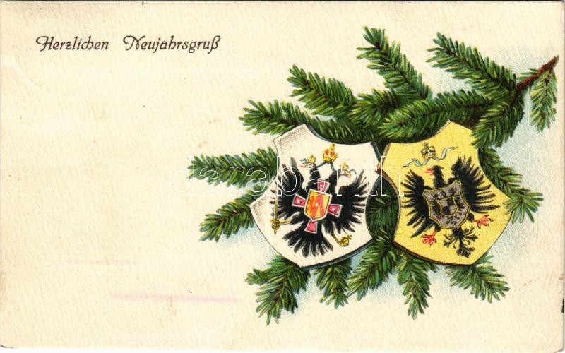 1914 Herzlichen Neujahrsgruß / WWI German and Austro-Hungarian K.u.K. military art postcard with New Year greeting, coats of arms, Viribus Unitis propaganda. B.K.W.I. 3158-3.