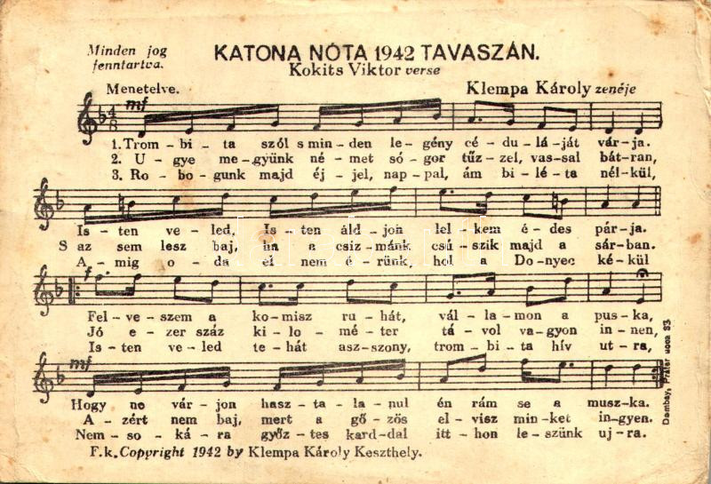 1943 Katona Nóta 1942 Tavaszán. Kokits Viktor verse, Klempa Károly zen... https://www.darabanth.com/hu/471-Gyorsarveres/471.0/Kepeslapok/Katonai~2000039/1943-Katona-Nota-1942-Tavaszan-Kokits-Viktor-verse-Klempa-Karoly-zeneje-kottas-levelezolap~II3192220