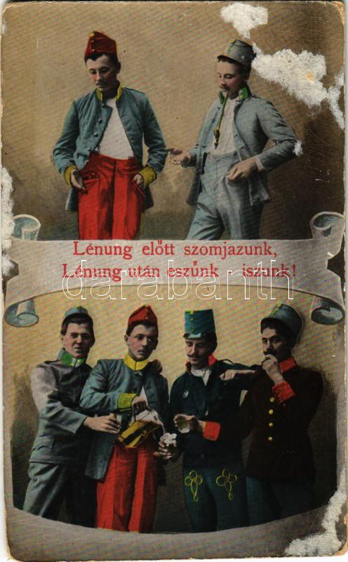 Lénung előtt szomjazunk, Lénung után eszünk iszunk! Osztrák-magyar zsoldos katonai humor / Austro-Hungarian military humour (felszíni sérülés / surface damage)