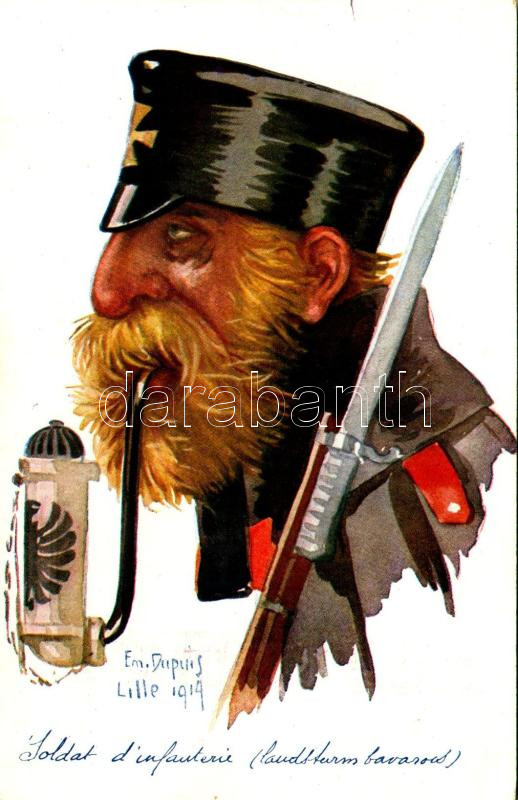 Leírás: Soldat d'infanterie (landsturm bavarois) / WWI German military art postcard, Bavarian infantry soldier. Visé Paris No. 36. "Leurs Caboches" s: Em. Dupuis (kis szakadás / small tear)