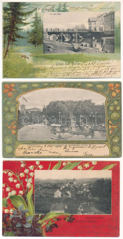 Leírás: 3 db RÉGI hosszú címzéses német szecessziós képeslap / 3 pre-1905 German Art Nouveau litho town-view postcards: Kempten, Elberfeld, Bünde