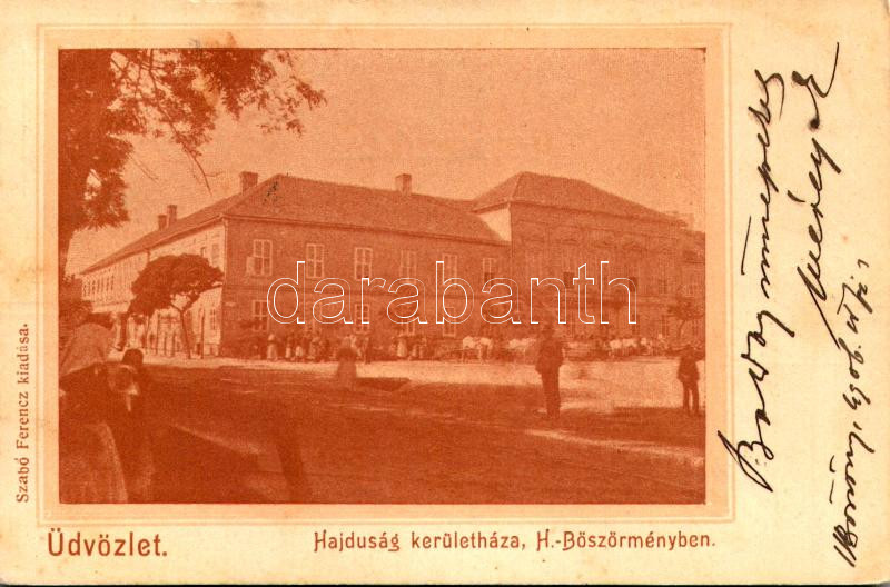 1906 Hajdúböszörmény, Hajdúság kerületháza. Szabó Ferenc kiadása https://www.darabanth.com/hu/471-Gyorsarveres/471.0/Kepeslapok/Magyarorszag~2000005/1906-Hajduboszormeny-Hajdusag-kerulethaza-Szabo-Ferenc-kiadasa~II3186391