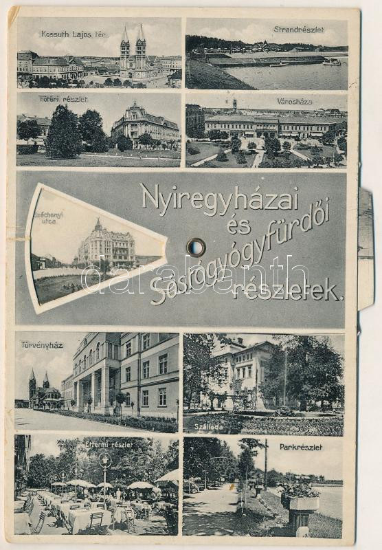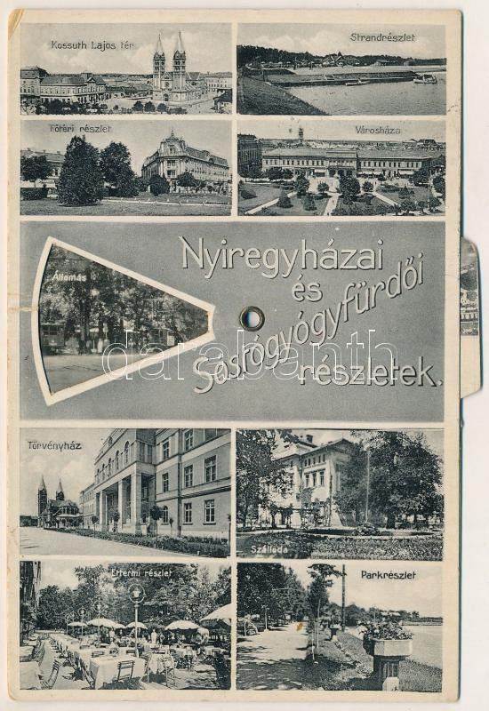 Leírás: 1937 Nyíregyháza, Sóstógyógyfürdő, strand, Kossuth Lajos tér, Főtér, park, Városháza, Törvényház, étterem és szálloda. Forgatható mechanikus képeslap kisvasúti vasútállomással (szakadás / tear)