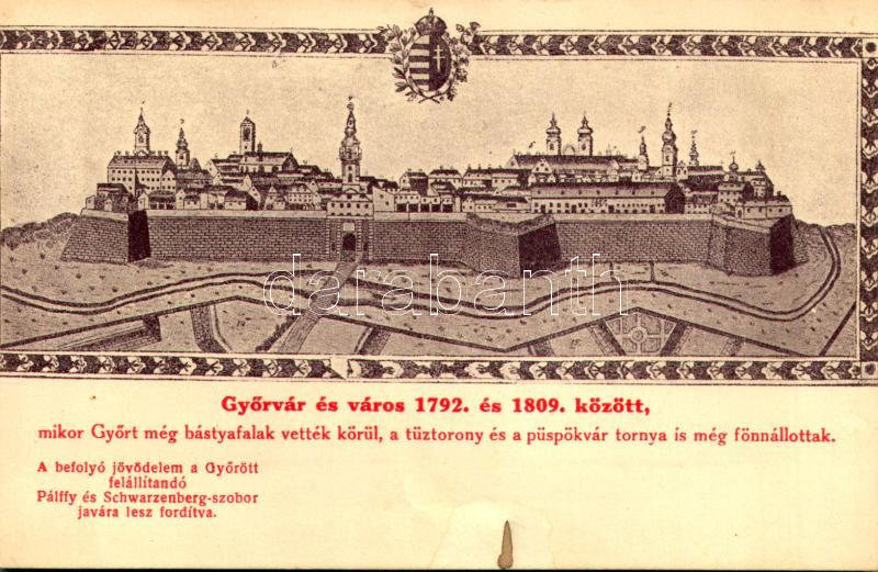 Leírás: Győr, Győrvár és város 1792 és 1809 között. Segélylap a Pálffy és Schwarzenberg szobor javára (fl)