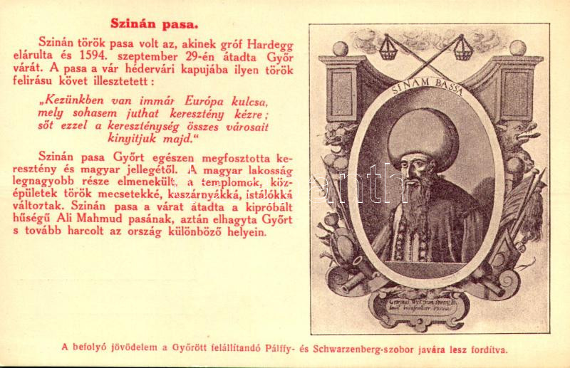 Győr, Szinán török Pasa, akinek gróf Hardegg elárulta és átadta Győr várát 1594 szeptember 29-én és egészen megfosztotta keresztény és magyar jellegétől. Segélylap a Pálffy és Schwarzenberg szobor javára