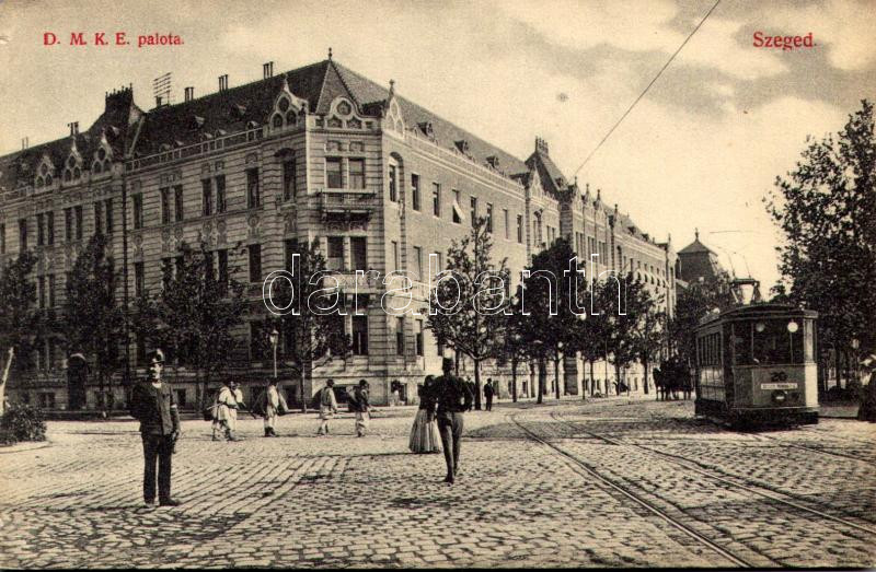 Leírás: Szeged, DMKE (Délmagyarországi Magyar Közművelődési Egyesület) palotája, villamos, csendőr. Grünwald Hermann kiadása (EM)