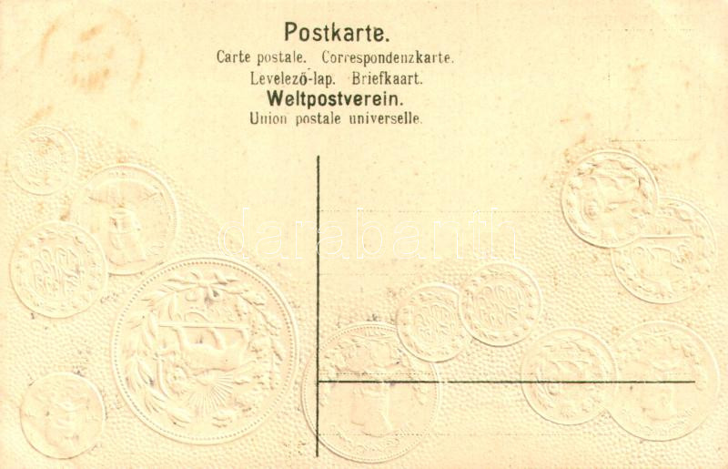 Leírás: Persien. Münzenkarte und Nationalflagge / Persian set of coins, currency exchange chart and flag. Emb. litho (lyuk / pinhole)