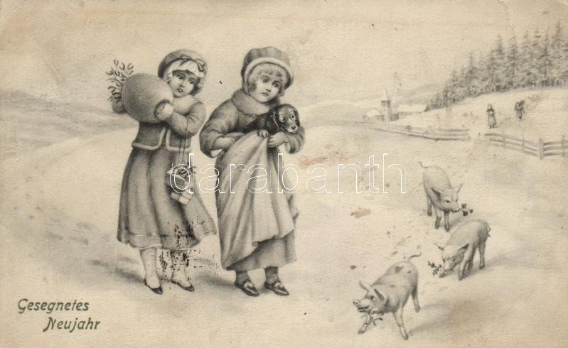 New Year, children, pigs, dog (fa) https://www.darabanth.com/hu/471-Gyorsarveres/471.0/Kepeslapok/Udvozlolapok-Unnepek~2000085/New-Year-children-pigs-dog-fa~II807043