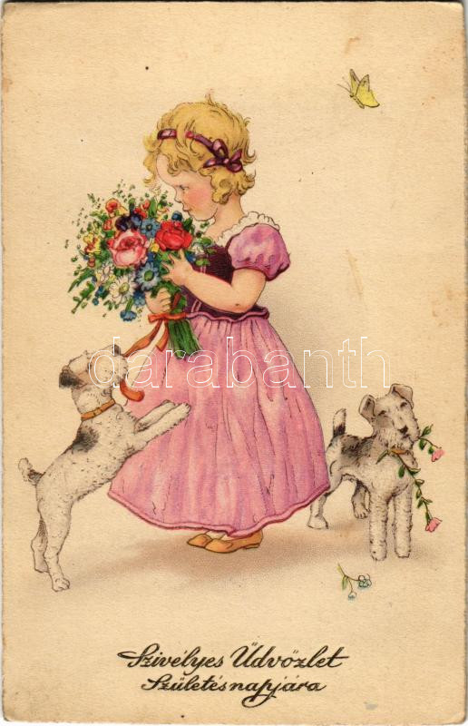 Leírás: Szívélyes üdvözlet születésnapjára, kislány kutyákkal / Name Day greeting, girl with dogs. Pittius