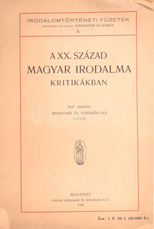 A XX. század magyar irodalma kritikákban. I. sorozat. Regények és elbeszélések 1. szám. Irodalomtörténeti füzetek 5. Bp., 1926, Pallas. Kiadói papÃrkötés, a gerincen és az elülsÅ‘ borÃtó felsÅ‘ sarkán kis hiánnyal.
