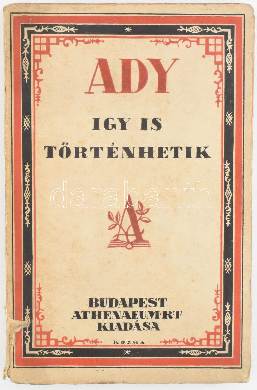 Ady Endre: Így is történhetik. Bp., (1925), Athenaeum. A papírborító Kozma Lajos (1884-1948) munkája. Kiadói papírkötés, sérült gerinccel és borítóval, címlap kijár.