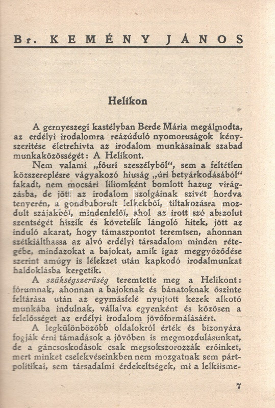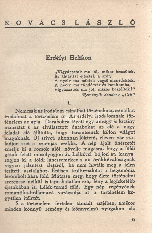 A munka az Erdélyi Szépmíves Céh tizenegyedik és tizenkettedik kiadványa, II. sorozatának 11-14. számú könyve. A kortárs erdélyi irodalom jeleseit felvonultató próza- és versantológia előtt az Erdélyi Helikont megalapozó, 1926. évi marosvécsi írótalálkozó nyomán írt irodalmi esszé. A kötetek illusztrációit rajzolta és grafikai kiállítását tervezte Bánffy Miklós és Kós Károly. Oldalszámozáson belül további egy, illetve öt egész oldalas illusztrációval. Példányunk mindkét kötetéből hiányzik az első két levél, a festett első előzéken és verzóján régi tulajdonosi bejegyzés.