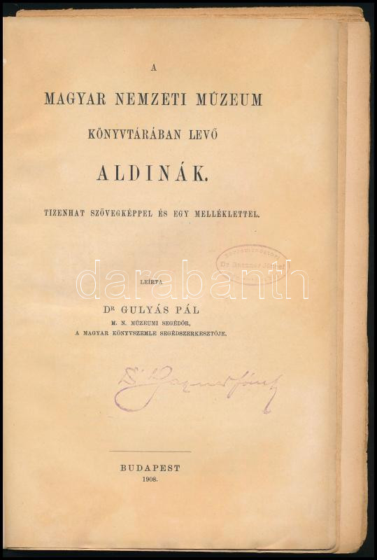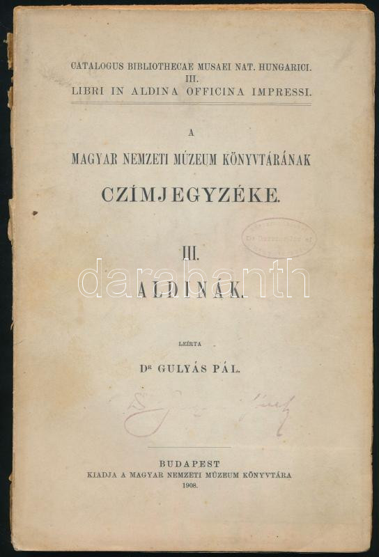 Gulyás Pál: A Magyar Nemzeti Múzeum Könyvtárának címjegyzéke III. köt. Aldinák. Leírta:- -. Catalogus Bibliothecae Musaei Nat. Hungarici III. Libri in Aldina Officina Impressi. Bp., 1908, Magyar Nemzeti Múzeum Könyvtára, 4+107 p.+1 t. Kiadói papírkötés, szétvált kötéssel, bélyegzésekkel és gyűjteményi címkével.