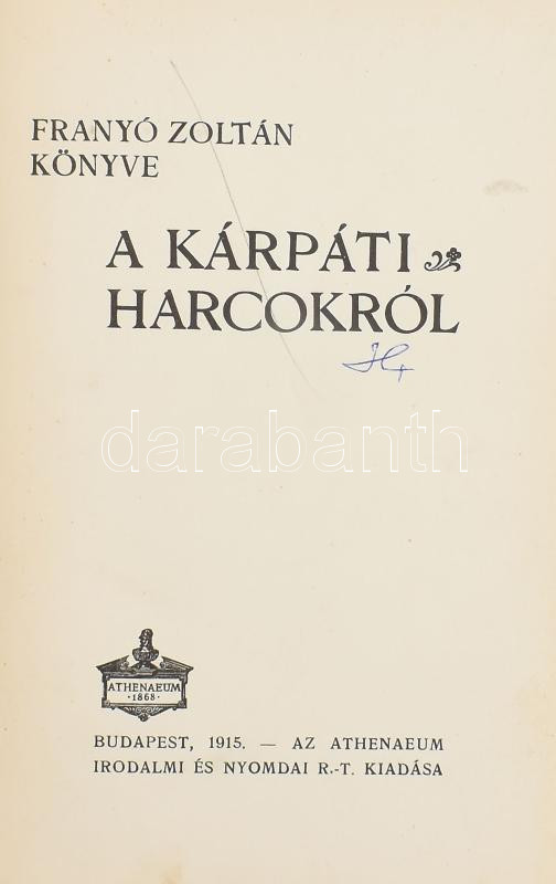 Franyó Zoltán: A kárpáti harcokról. Bp., 1915, Athenaeum... https://www.darabanth.com/hu/471-Gyorsarveres/471.0/Konyvek/Konyvek-Egyeb-ritkasagok~1000037/Kolligatum--Franyo-Zoltan-A-karpati-harcokrol-Bp-1915-Athenaeum-211p-plus-Aage-Medelung-~II3193372